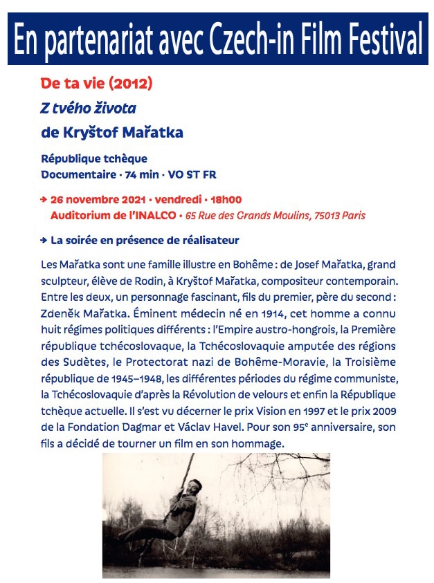 Vendredi 26 Novembre 2021 - 18HAuditorium de l’INALCO, 65 Rue des Grands Moulins, 75013 Paris Projection du film "De ta vie" En partenariat avec Czech-In Film Festival, Projection du film "De ta vie" de Kryštof Mařatka, en  présence du réalisateur.« Les Mařatka sont une famille illustre en Bohême : de Josef Mařatka, grand sculpteur, élève de… Read More »Festival Tcheque 26 nov 21